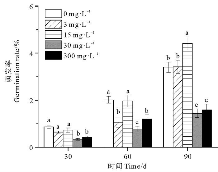 2 实验结果 2.1 休眠延长期的种子萌发率各处理组鳗草种子的累积萌发率随时间延长呈现逐渐升高趋势,至90 d时达到最大值(见图 3)。单因素方差分析表明,实验结束时,30和300 mg·L-1处理组的种子累积萌发率显著低于其它处理组,分别仅为对照组的41%和51%(P<0.05),而15 mg·L-1处理组累积萌发率最高,是对照组的1.1倍。