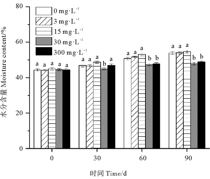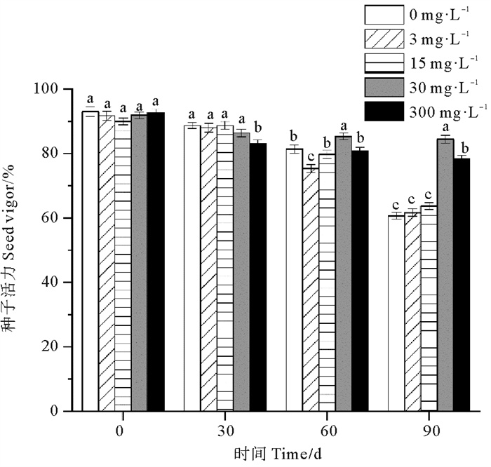 各处理组鳗草种子的水分含量随时间推移总体呈上升趋势,至90 d时达到最大值,其中30和300 mg·L-1处理组种子水分含量上升不明显(见图 7)。单因素方差分析表明,至实验结束,30和300 mg·L-1处理组鳗草种子的种子水分含量最低,显著低于其它处理组(P<0.05),分别为对照组的88%和91%,而3和15 mg·L-1处理组水分含量最高,与对照组无显著差异(P>0.05)。