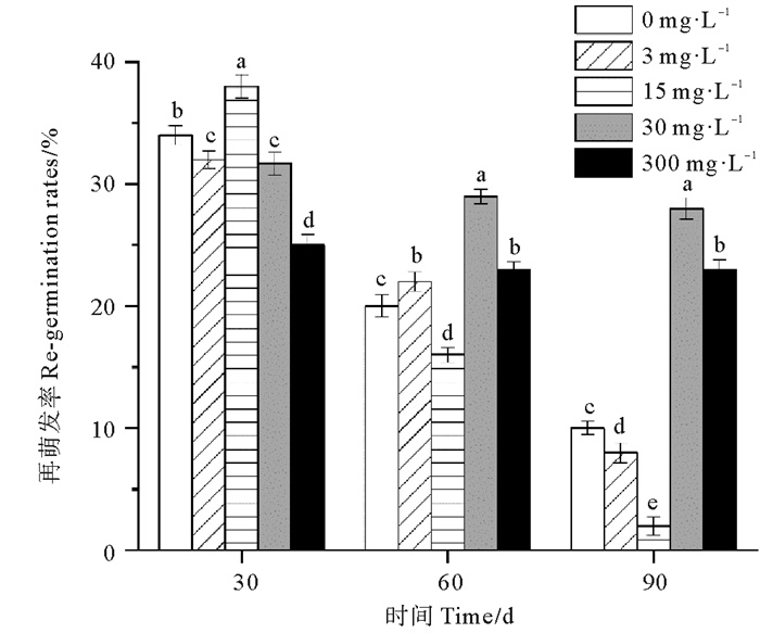 各处理组鳗草种子的再萌发率随时间延长呈现下降趋势(见图 5)。单因素方差分析表明,实验结束时,30 mg·L-1处理组的再萌发率最高,显著高于其它处理组,为对照组的2.8倍。15 mg·L-1处理组的再萌发率最低,显著低于其它处理组(P<0.05),仅为对照组的20%。