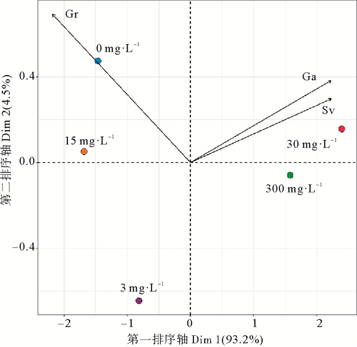 ( Gr为萌发率;Ga为再萌发率;Sv为种子活力。Gr is germination rate; Ga is regermination rate; Sv is seed vigor. ) 图 6 不同ABA浓度与鳗草种子各指标的排序图 Fig. 6 Sequence diagram of different ABA concentrations and various indexes of eelgrass seeds |