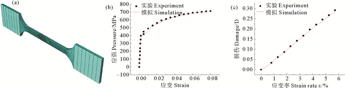 为了验证程序的正确性,数值模拟了韧性金属的标准单轴拉伸试验,计算模型如图 2(a)所示,试样参数与规范实验一致,模型一端固定,另一端施加位移荷载,数值模拟与实验结果进行对比(见图 2(b)、(c)):两者基本吻合,验证了材料子程序和计算设置能够实现单元塑性软化、损伤,可应用于后续数值计算。