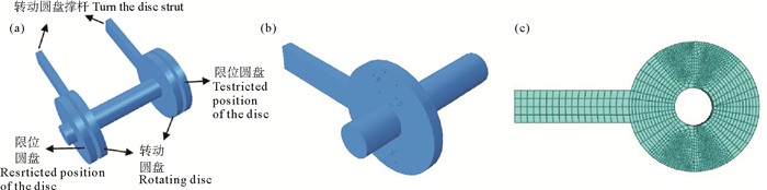 水下传动装置如图 3(a)所示,限位圆盘和转动圆盘构成配合面,外侧限位圆盘固定在轴上,内侧转动圆盘由循环载荷F驱动绕轴转动,驱动力F作用在撑杆上,作用方向如图 3(a)。有限元模型取一侧配合面、轴组成,计算模型尺寸相对工程结构等比例缩小,如图 3(b)所示:两圆盘外半径皆为10 mm、厚度为2 mm,撑杆长度为38 mm,两圆盘配合面间隙为0.6 mm,圆柱轴半径为3 mm、长为30 mm。依分形理论建立三维磨粒模型,如图 4(c)所示,磨粒最大外直径为1 mm。本研究中,循环正弦驱动力,幅值为600 N,周期为0.2 s。依据传动装置实际工作状态观察,磨粒初进入两圆盘间隙,完好附于配合面表面,内侧圆盘在驱动力作用下循环转动而引起磨粒磨损。传动装置处于海洋环境,配合面上腐蚀不可避免,很可能引入新的应力集中,从而影响磨粒和配合面损伤演化过程;另外,传动装置运动与整体水入水过程一致,因此配合面循环转动中还存在高低温变化,无磨粒磨损情况下环境温差对于配合面应力状态影响较小,但是磨粒局部应力集中十分显著,应考虑温度循环的影响。本文中,将对点腐蚀、面腐蚀状态下传动装置磨粒磨损过程进行计算,并引入温度因素,对比研究海洋环境下传动装置小间隙配合面磨粒磨损与传动性能变化规律,具体工况见表 1。