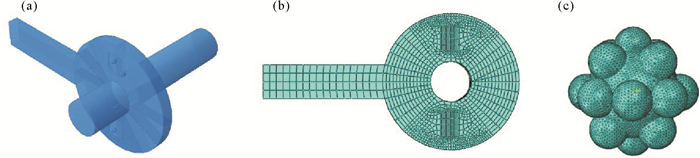 图 4 面蚀(2蚀面)磨粒(3颗)磨损(a) 模型,(b) 配合面网格,(c) 分型磨粒模型与网格 Fig. 4 Surface erosion (2 erosion surface) abrasive particles (3) wear (a) model, (b) mating surface mesh and (c) parting abrasive model and mesh |