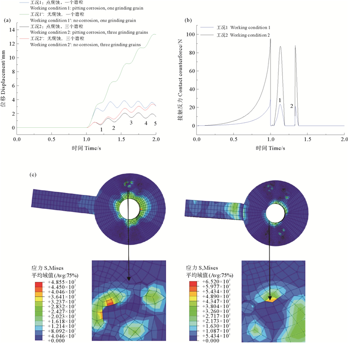 细观上进一步分析上述现象产生的原因,磨粒与配合面之间的的挤压旋转是一种符合“犁耕”理论的现象,即任何物体想要占有一定的空间,都必须排除以前在这个地方的其他物体。而在上述计算模型中,由于腐蚀及磨损产生了磨粒及配合面产生了孔洞、沟犁[17]现象,磨粒与配合面不断地啮合或分离,而形成一种反复的离合过程。在啮合与分离的过程中,磨粒的某一部分,由于破损或脱落而产生细微破坏[18],这逐渐改变了接触条件,使得配合面的旋转更加困难,同时,磨粒及配合面磨损不断加剧;而且,配合面旋转过程中出现接触变形,使磨损微粒嵌入配合面表面磨损特性如图 5(c)图 6(c)所示,从而产生切削作用,切削的阻力就是磨损阻力,而由接触反力图 5(b)、图 6(b)可见,两类腐蚀情况下磨粒和配合面间接触力远大于无腐蚀情况,这是由于蚀坑的几何奇异性加大了应力三轴度,增大的应力三轴度显著加速损伤演化,磨损情况下点腐蚀的蚀坑间存在应力集中融合趋势,即产生应力集中与损伤条带,加速磨粒与配合面损伤演化,从而使得两者间接触力更快速发展。需要注意,点腐蚀对磨粒磨损的影响小于面腐蚀,即面腐蚀磨损时结构运动性能下降更显著,由模拟结果分析,磨粒进入面腐蚀区域后,在其平面内存在两个方向的完全约束,而点腐蚀仅对磨粒局部产生约束,面腐蚀情况下配合面和磨粒中应力三轴度增大速度和幅值都远大于点腐蚀情况,结构和磨粒塑性破坏速度和程度也就是远大于点腐蚀情况,因此结构传动性能下降更快。