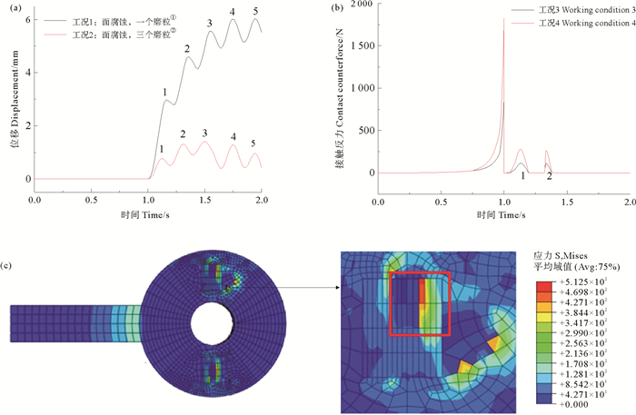 (①Working condition 1: surface corrosion, one grinding grain; ②Working condition 2: surface corrosion, three grinding grains) 图 6 (a) 旋转位移与时间关系,(b)接触力与时间关系及(c)面蚀配合面磨损特征 Fig. 6 (a) Relation between rotation displacement and time, (b) relation between contact force and time and (c) wear characteristics of surface corrosion and surface |