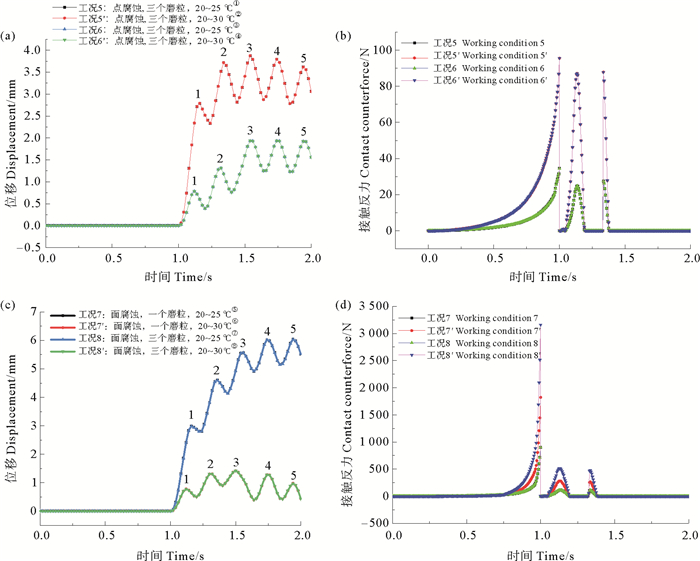 (①Working condition 5: pitting corrosion, one grinding grain, 20~25 ℃; ②Working condition 5′: pitting corrosion, one grinding grain, 20~30 ℃; ③Working condition 6: pitting corrosion, three grinding grains, 20~25 ℃; ④Working condition 6′: pitting corrosion, three grinding grains, 20~30 ℃; ⑤Working condition: surface corrosion, one grinding grain, 20~25 ℃; ⑥Working condition: surface corrosion, one grinding grain, 20~30 ℃; ⑦Working condition: surface corrosion, three grinding grains, 20~25 ℃; ⑧Working condition: surface corrosion, three grinding grains, 20~30℃.) 图 7 (a) 温度变化下点腐蚀旋转位移与时间关系、(b)点腐蚀接触力与时间关系、(c)温度变化下面腐蚀旋转位移与时间关系及(d)面腐蚀接触力与时间关系 Fig. 7 (a) The relationship between the corrosion rotation displacement and time at the point under temperature change, (b) the relationship between the corrosion contact force and time at the point, (c) The relationship between the corrosion rotation displacement and time at the point under temperature change and (d) the relationship between the corrosion contact force and time at the surface |