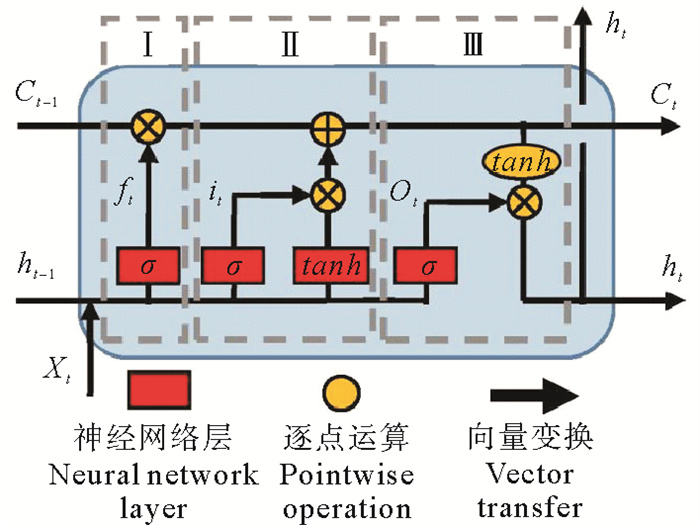 | $ {\boldsymbol{f}_\boldsymbol{t}} = \sigma ({\boldsymbol{W}_\boldsymbol{f}}\cdot[{\boldsymbol{h}_{\boldsymbol{t}{\rm{ - }}\mathit{\pmb{1}}}}, {\boldsymbol{X}_\boldsymbol{t}}] + {b_f}){\rm{ }} $ | (3) |