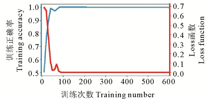 训练过程一共重复训练样本数据10次,单次训练采用小批量梯度下降算法,每批次喂入量为64个样本。训练学习率LR设置为0.001,损失函数采用二元交叉熵函数(Binary Cross-Entropy),对于包含n个训练样本的批次,损失函数为: