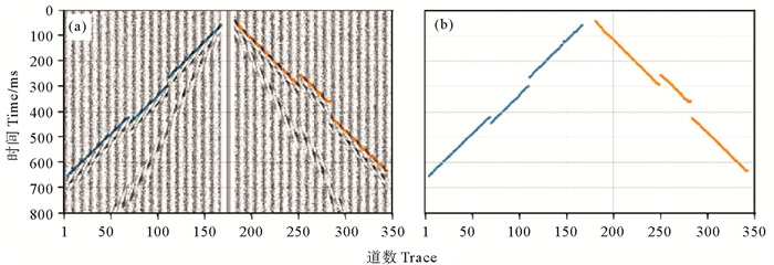 ( (a)初至拾取结果剖面;(b)初至拾取结果。(a) The profile with the first break picking results; (b) The first break picking results. ) 图 4 含噪模拟剖面拾取试验(0.45噪音方差) Fig. 4 The first break picking test of simulated profile with noise (the variance of 0.45) |