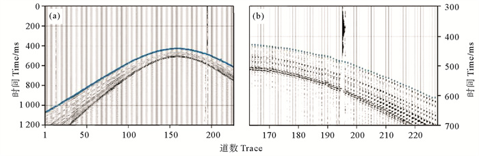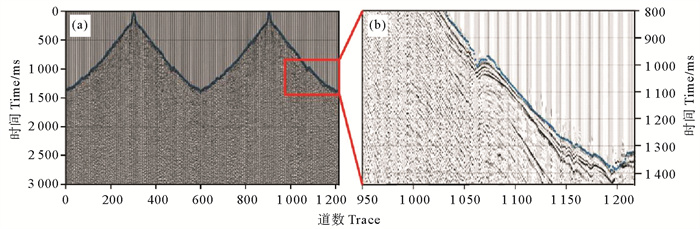 ( (a) 初至拾取结果剖面;(b)异常道附近拾取结果。(a) The profile with the first break picking results; (b) The first break picking results near the abnormal traces. ) 图 6 海洋OBC地震资料初至拾取试验 Fig. 6 The first break picking test of marine OBC seismic data |