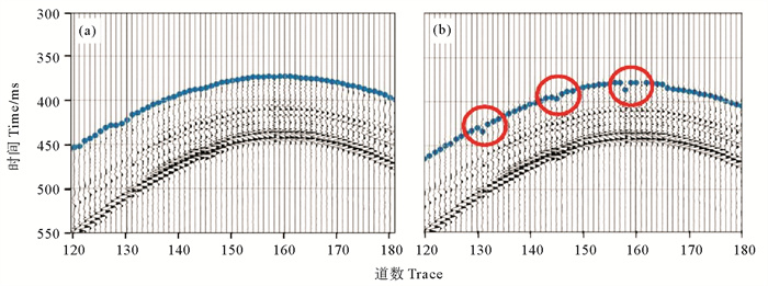 与目前应用广泛的能量比法拾取初至进行对比,能量比法利用初至前后时窗内能量特征的差异来判断初至时间,在工业生产实践中取得良好的效果,但仍存在复杂地表条件下拾取精度不高的问题。图 7(a)是本文LSTM神经网络拾取结果,图 7(b)是能量比法的拾取结果。能量比法拾取结果存在明显跳点,见图 7(b)中红圈,并且整体波形不够平滑,吻合度较低,LSTM神经网络方法拾取精确度更高,结果更加可靠。