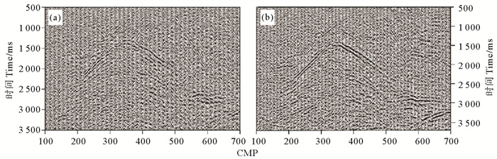 ( (a)使用能量比法拾取初至的叠加剖面;(b)使用本文LSTM神经网络方法拾取初至的叠加剖面。(a) The stacked profile using the first break picked by commercial software; (b) The stacked profile using the first break picked by LSTM network. ) 图 9 初至波层析静校正叠加剖面 Fig. 9 Stacked profiles applied first arrival tomographic statics |
