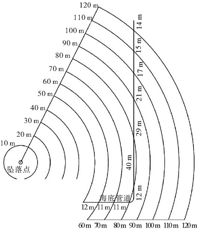 如图 1所示,以该工程为例,对海底管道在船锚撞击作用下的失效概率进行计算,并分析影响管道失效概率的因素及海底管道的受损失效风险:本文主要从船锚质量、管道尺寸及材料、管道所在区域距船锚坠落点距离这三个方面进行分析。同时考虑随机变量变异性,探讨了管道失效概率对影响其大小的各变量的敏感性。