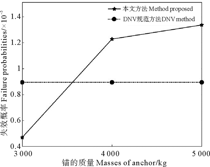 DNV法中,对于同一类别的坠物无法考虑质量对管道损伤的影响,而本文的方法则可予以考虑。对于表 4中的管道4,选取质量分别为3 000、4 000、5 000 kg的霍尔锚[10]作为坠物,使用DNV法及本文方法计算其失效概率,结果如图 2所示。由计算结果可知,本文方法可考虑质量变化的影响:失效概率随着船锚质量的增加而增大。由表 3可知,随着船锚质量的增加,该管道的风险等级由1级变为了2级,受损的风险增大。由此可见,对于质量不同的船锚,应采取不同的防护措施,以降低风险。而DNV法的结果为一常量,无法考虑质量变化的影响,会使结果偏于危险,与实际情况不符。