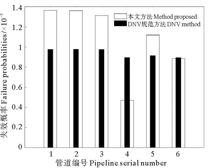管道尺寸、材料影响管道对于撞击能量的吸收,从而对管道的失效概率产生影响。为分析其影响,选取表 4中6种不同管道,使用DNV法及本文方法进行管道的失效概率计算,其结果如图 3所示。由计算结果可知,对于本文方法,管道尺寸、材料对失效概率的影响较大:不同管道的失效概率皆不相同,对于管道4,其管径、壁厚较其他管道大,抵抗撞击的能量较强,其风险等级为1级,而其余管道抵抗撞击的能力较差,风险等级为2级;而对于DNV法,管道尺寸、材料失效概率的影响几乎无影响,失效概率基本保持为一常量,风险等级皆为1级。对于管道1、2、3、5,DNV法偏于危险,而对于管道4,DNV法则偏于保守。由以上分析可知,管道尺寸、材料对于失效概率有所影响。应予以考虑,以降低受损风险。