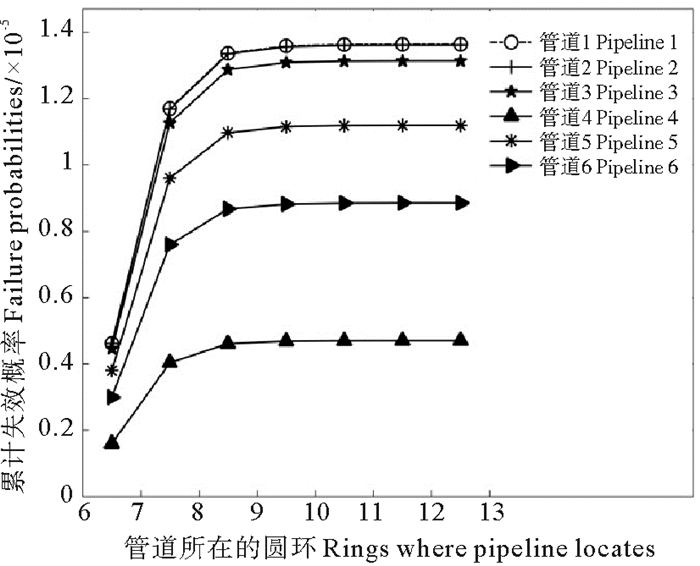 不同区域内管线段的失效概率存在差异:由船锚的漂移分布函数可知,船锚落在距坠落点较远区域内的概率较小,相应的管道失效概率也越小。为分析其影响,选取表 4中6种不同管道,计算距坠落点距离不同的区域内管线段的失效概率及累计失效概率,其结果如图 4、图 5所示。在距坠落点较近的区域内,失效概率随距离的增加而增大,并在第7、8个圆环之间的区域内达到最大,之后随距离的增加逐渐减小;累计失效概率起初随距离的增加而增大,随后几乎不变。由以上分析可知,在距坠落点较近区域内,管线受损风险较大,距坠落点较远区域内的管线受损风险较小。据此可采取合理防护措施,以降低风险、节省成本。