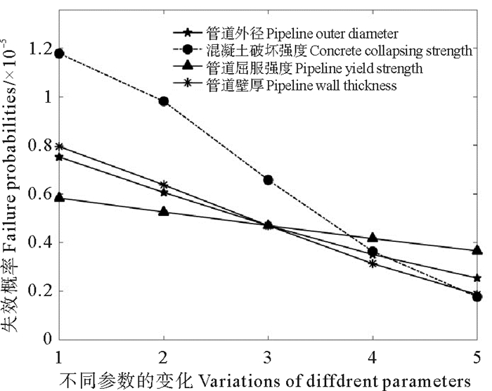在求解管道失效概率时,将管径、管道壁厚、屈服强度、混凝土破坏强度作为随机变量来处理。其本身的变异性会影响管道的失效概率。现对其进行敏感性分析,以表 5中第4列参数为基准值,依次改变上述随机变量的取值,计算管道的失效概率,结果如图 6所示。由计算结果可知,随着上述随机变量取值的增大,管道的失效概率不断减小。其中,混凝土破坏强度对失效概率的影响最大,其次为管道外径及管道壁厚,管道屈服强度的影响最低。由以上分析可知,在管道尺寸、材料条件受限制无法改变的情况下,适当增加混凝土保护层的强度,可降低管道的受损风险。