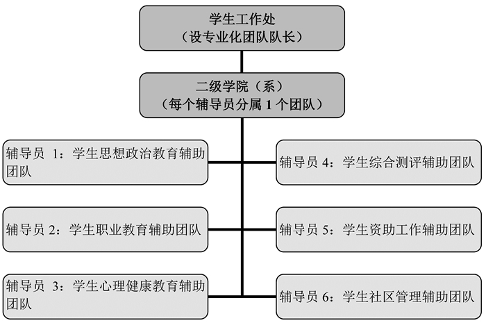 有学生工作专家曾把高校辅导员的事务性工作分为12个专业化学生事务管理系统[5],还有的专家提出要借鉴美国和英国学生事务管理的模式。这些研究对推动我国辅导员专业化发展值得借鉴。有鉴于此,本文构建了符合辅导员工作实际情况、具有可操作性的辅导员工作专业化团队。