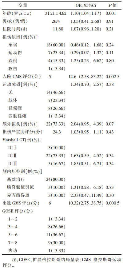 3.2 预后因素分析多项研究[19-20]显示老年DAI患者死亡率更高,长期预后更差。本研究中,患者平均年龄(31.21±4.62)岁,比一般的DAI患者年轻。年龄,无论是作为连续变量还是作为二分类变量,在调整其他预后因素后,仍是长期不良预后的独立预测因素。此外,本研究发现在入院和出院时,GMS检测到长期不良预后与意识水平下降之间存在关联;但调整其他因素之后,未发现GMS的任何独立预后预测价值。