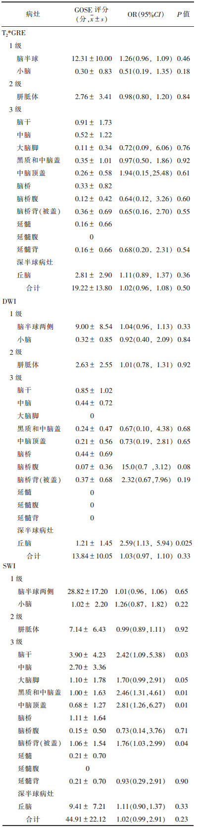 2.5 多变量分析预后因子以GOSE为因变量进行多变量分析,结果显示,DWI序列显示的丘脑病灶及SWI序列显示的黑质和中脑被盖区病灶均与长期不良预后显著相关(均P < 0.05)。≥30岁患者的黑质和中脑被盖出血性病灶与长期不良预后独立相关(P=0.012)。