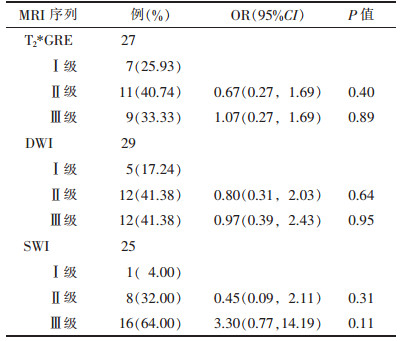 3 讨论 3.1 MRI序列病灶分布MRI因诊断准确率高,已成为临床检测出血和非出血性DAI病灶的首选方式[8]。DWI可显示非出血病灶,T2*GRE和SWI可显示出血病灶,但SWI序列能更好地显示组织间的敏感性差异,因此对出血病灶的敏感性高于T2*GRE。以往研究[9]证明,SWI比T2*GRE显示更多的微出血病灶,与本研究结果一致。但由于脱氧、缺血可能被误读为出血性病灶,使得SWI序列比T2*GRE和DWI序列更难鉴别[10]。SWI发现的病灶数量多于DWI,但DWI序列中,细胞水肿增加了信号强度,T2信号也增强,两者可见不同的损伤改变,各有优势[11-12]。
