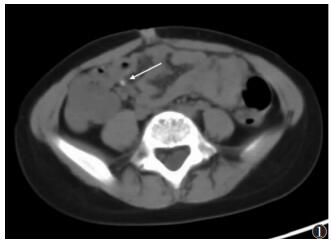 图 1 男,6岁,急性单纯性阑尾炎,阑尾外径6 mm,阑尾根部管腔内见一小结石(长箭),管壁略增厚 |