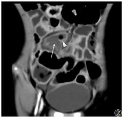图 2 男,8岁,急性化脓性阑尾炎伴穿孔,阑尾外径明显增宽,达12.5 mm,管腔积气积液(三角),管壁下缘局部不连,周围积脓(长箭),盆腔少量积液 |