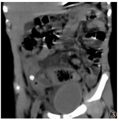 图 3 男,3岁,急性坏疽性阑尾炎,阑尾外径明显增宽,管壁明显肿胀,管腔内结石,盲肠壁增厚,盆腔积液 |