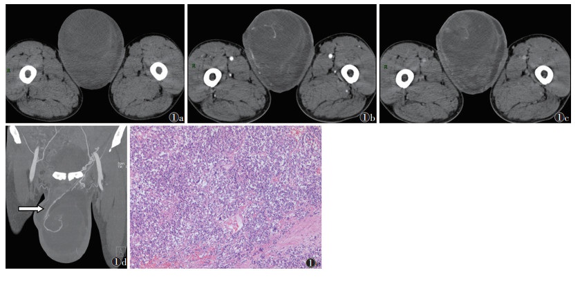 | 注:患者,男,49岁。图 1a~1c分别为平扫、动脉期和静脉期图像,左侧睾丸见混杂密度肿块,体积较大,内见多发液化坏死区;动脉期肿瘤实性成分轻中度强化,囊性坏死区无强化,分隔强化,未见脂肪及钙化成分;静脉期肿瘤内供血血管强化程度减退。图 1d为MIP图像,示肿块内见粗大供血动脉(睾丸动脉)(白箭)。图 1e为病理图像,示肿瘤细胞弥漫性增生伴散在淋巴细胞浸润,排列成片状、巢状或条索状,细胞异型性大,具有明显的细胞膜,核分裂象常见(HE染色,高倍放大) 图 1 睾丸精原细胞瘤CT图像及病理图像 |