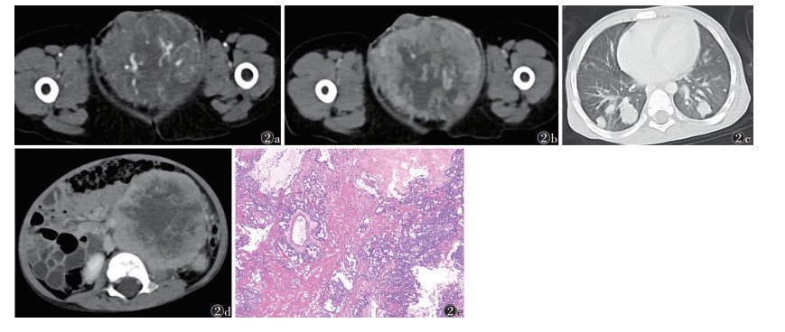 | 注:患者,男,2岁。图 2a,2b分别为增强扫描动脉期和静脉期图像,示睾丸体积显著增大,可见类圆形肿块,密度不均,中心见大片液化坏死区,动脉期肿瘤实性成分明显不均匀强化,可见不规则斑片状、条索状强化影;静脉期强化持续增加,呈渐进性强化特征;未见钙化及脂肪成分。图 2c,2d分别为肺窗和腹部CT图像,可见双肺、腹腔及腹膜后多发转移。图 2e为病理图像,示肿瘤细胞胚外(主要为卵黄囊)分化,见网状-微囊、附壁、卵黄囊、管状结构,并见Schiller-Duval小体形成,核深染而不规则,核仁明显,核分裂象可见(HE染色,低倍放大) 图 2 睾丸卵黄囊瘤CT图像及病理图像 |
