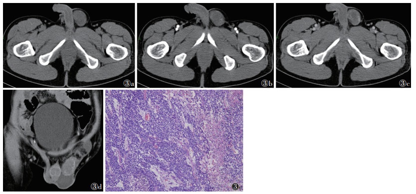 4例中,1例位于右侧睾丸,3例左侧。睾丸密度不均,CT值20~50 HU,中心见液化坏死区,肿瘤实性成分呈轻中度强化,强化较均匀,囊性坏死区无强化,边界不清,周围脂肪间隙消失,肿块内未见脂肪及钙化成分(图 3)。