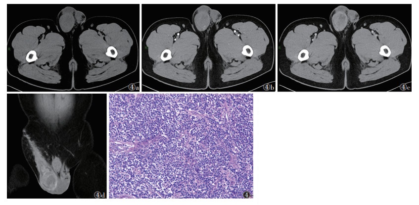 7例中,2例位于右侧睾丸,5例左侧。肿块体积较大,密度不均、形态欠规则,CT值15~45 HU,中心见多发液化坏死区。肿瘤实性成分明显不均匀强化,可见不规则斑片状、结节状、条索状强化影,呈渐进性强化,肿块内坏死区无强化,边界清晰,未见钙化及脂肪成分(图 2)。2例术前已发生远处转移,2例术后1年腹腔多发淋巴结转移。