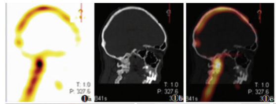 | 图 1 男,72岁,前列腺癌骨转移,颈椎持续性疼痛 图 1a SPECT/CT局部融合显像示:颅骨、颅底部、上颈椎可见小片状放射性核素浓聚区 图 1b 颅骨CT平扫示:颅骨板障密度增高,髓腔皮质边界模糊,颅骨密度不均匀,双侧蝶骨、下颌骨、寰椎、枢椎均可见斑片状密度增高影。右侧上颌窦内可见类圆形密度增高影 图 1c SPECT/CT局部融合图像示:颅骨、颅底部可见小片状放射聚集区,上颈部可见高放射性核素聚集 |