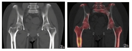 | 图 2 女,55岁,右侧乳腺癌术后1年6个月,股骨及髂骨2处疼痛 图 2a 骨盆CT平扫示:两侧髂骨、双侧髋臼、右侧股骨头、右侧股骨上段多发溶骨性骨质破坏区,皮质溶解 图 2b SPECT/CT局部融合显像示:两侧髂骨、骶椎、髋臼、右侧股骨头、右侧股骨上端多发散在斑片状放射性核素聚集灶,部分呈“冷区”改变 |