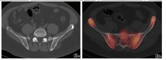 | 图 3 男,37岁,黏液脂肪瘤骨转移,骶骨疼痛 图 3a CT平扫示:骶骨可见骨质破坏,L4、L5椎体下关节面均可见M形局限性凹陷,边缘硬化 图 3b SPECT/CT局部融合显像示:骶骨及左侧髂骨病灶均见周围放射性核素不均匀聚集,溶骨性骨质破坏区似可见轻微放射性核素聚集。双侧骶髂关节可见放射性核素浓聚,左侧显著 |