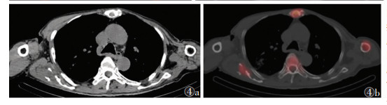 | 图 4 男,75岁,前列腺癌骨转移,肩胛骨及胸骨2处疼痛 图 4a 胸廓及肱骨CT平扫示:左肱骨近端及中下段可见膨胀性骨质破坏,骨质密度增高,胸骨及右肩胛骨、左侧第9后肋可见类似改变;T10椎体可见片状骨质密度增高影 图 4b SPECT/CT融合平扫显示:左肱骨、胸骨及右肩胛骨、左侧第9后肋溶骨破坏区未见明显放射性浓聚,边缘骨质密度增高区可见不同程度放射性改变 |