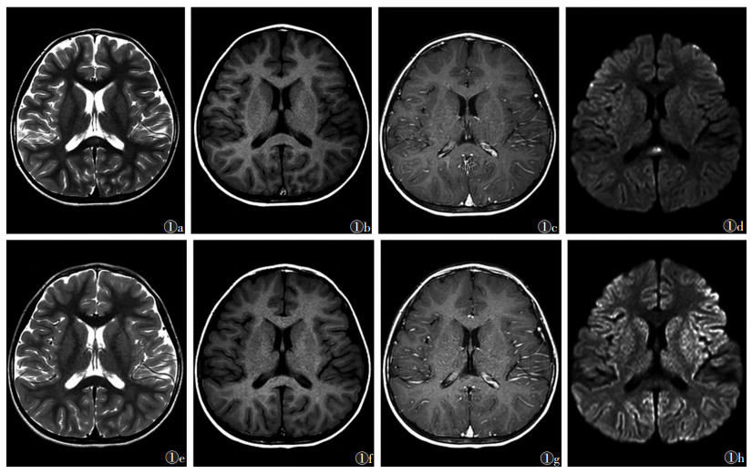图 1 女,5岁,因间断发热、呕吐6 d并抽搐入院 图 1a~1d 入院首次MRI检查,提示胼胝体压部椭圆形、边界不清的病灶 图 1a T2WI呈稍高信号 图 1b T1WI呈稍低信号 图 1c T1WI增强扫描病灶无强化 图 1d DWI呈高信号 图 1e~1h 分别为治疗12 d症状明显好转后复查的T2WI、T1WI、T1WI增强扫描、DWI图像,均示胼胝体压部异常信号基本消失 |