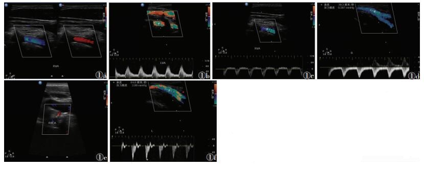 图 1 男,67岁,高血压17年,糖尿病6年。颈动脉超声示双侧颈动脉及右侧锁骨下动脉多发粥样硬化斑块形成,右侧锁骨下动脉窃血综合征(部分型);心脏超声示左室后壁增厚,左房偏大 图 1a 右侧椎动脉CDFI,收缩期蓝色舒张期红色双向血流 图 1b 对侧椎动脉代偿性加快的血流频谱 图 1c 右侧椎动脉双向血流异常频谱图像 图 1d 右侧上肢腋动脉舒张期反向血流消失的异常频谱 图 1e 右侧锁骨下动脉起始段粥样硬化斑块致局段管腔狭窄的彩色血流图像 图 1f 对侧上肢腋动脉正常血流频谱图像 |