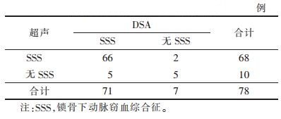 以DSA为金标准,超声对SSS的诊断灵敏度为92.96%(66/71),特异度为71.43%(5/7),准确率为91.03%(71/78)。