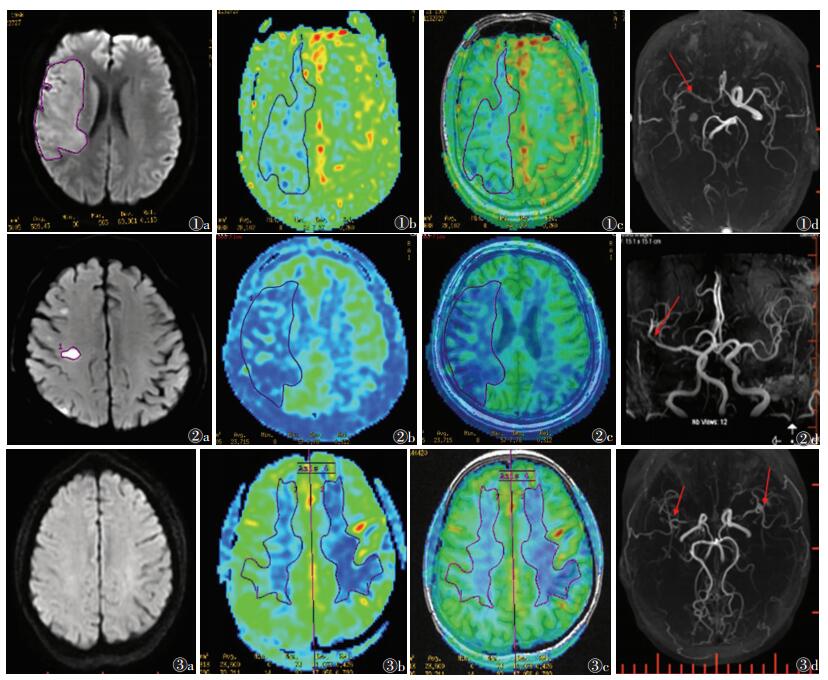图 1 男,64岁,急性脑卒中 图 1a DWI示右侧额顶叶斑片状高信号影 图 1b,1c 自旋标记技术-脑血流量图(ASL-CBF)及ASL与3D-T1匹配图像,ASL可见右侧额顶叶灌注较左侧明显减低 图 1d MRA示右侧大脑中动脉远段以及右侧前交通动脉局部血管血栓形成,管腔狭窄(箭头) 图 2 男,50岁,亚急性脑卒中 图 2a DWI示右侧侧脑室旁大片稍高信号影 图 2b,2c ASL-CBF及ASL与3D-T1匹配图像,ASL可见右侧半卵圆区较左侧灌注明显减低 图 2d MRA示右侧大脑中动脉管腔稍细,显影较左侧欠佳(箭头) 图 3 女,48岁,短暂性脑缺血发作 图 3a DWI未见异常表现 图 3b,3c ASL-CBF及ASL与3D-T1匹配图像,ASL示左侧额顶叶白质区灌注较右侧明显减低区 图 3d MRA可见左右侧大脑中动脉M1段血栓形成,管腔狭窄,周围多发小吻合血管(箭头) |