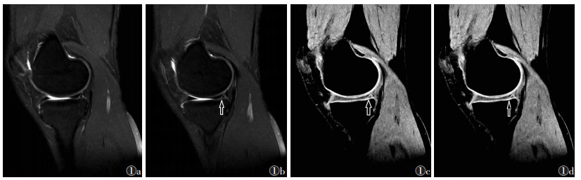 图 1 男,24岁 图 1a,1b 2D-SPACE图,示半月板后角条状稍高信号,达下关节面(箭头) 图 1c,1d 3D-SPACE图,示半月板后角条状高信号,达下关节面,较 图 1a,1b 直观清晰(箭头) |