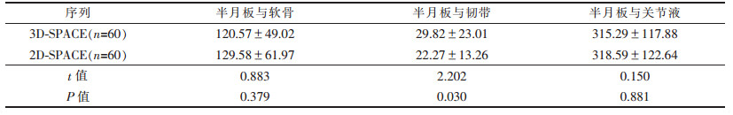 3D-SPACE序列图像半月板与韧带的对比噪声比明显高于2D-SPACE序列(P < 0.05)(表 1)。