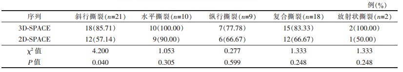 3D-SPACE序列诊断半月板斜行撕裂的准确率明显高于2D-SPACE序列(P < 0.05)(表 2)。