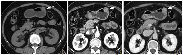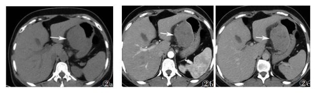 | 图 2 男,51岁 图 2a CT平扫示胃小弯侧类圆形软组织密度肿块影,腔外生长,胃壁侧可见局限性小凹陷,瘤体密度欠均,边界尚清(箭头) 图 2b 增强扫描动脉期轻度强化,其内见小片状低密度区(箭头) 图 2c 静脉期强化仍可见小片状低密度区(箭头) |