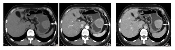 | 图 3 女,48岁 图 3a CT平扫示胃大弯侧类圆形软组织密度肿块影,腔内生长,密度尚均匀,边界清晰(白箭) 图 3b 增强扫描动脉期不均匀轻度强化(白箭) 图 3c 静脉期瘤体强化更明显(白箭);腹膜后肿大淋巴结,强化均匀(黑箭) |