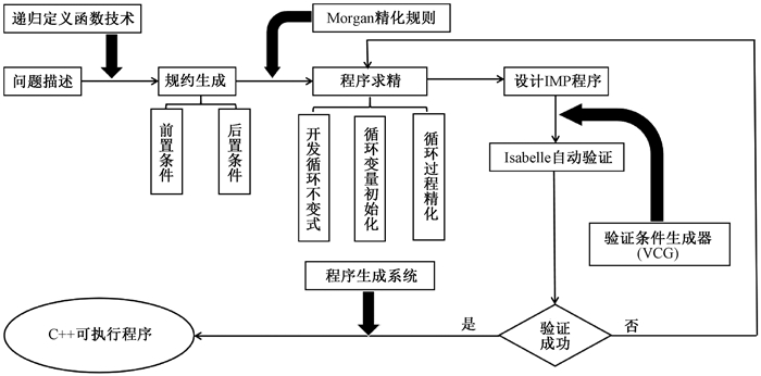 从问题规约出发,使用各种规则进行演绎推理,文献[6-7]提出并发展了一种基于演绎推理的程序开发方法,使程序开发和正确性验证同时进行,但其无法求精至可执行程序。文献[8-9]基于PAR方法[10]对多类算法进行程序求精,扩展了PAR方法的应用范围,进一步简化了多类算法的推导和证明,但其生成的Apla抽象程序经人工推导而成,后续并未进行机器辅助证明,验证的可信度较低。文献[11-12]使用Isabelle定理证明器[13]对形式化推导生成的抽象程序进行机械验证,但其验证条件是手工生成的,自动化程度不足。本文针对以Morgan[14]为代表的传统程序求精方法无法求精至可执行程序的问题,利用平台生成可执行程序,提高了程序求精的完整度;利用VCG可自动生成验证程序正确性的条件,大幅度提高了算法程序验证的自动化程度;使用Isabelle定理证明器辅助证明求精得到的IMP程序[15],确保了验证的可信度。