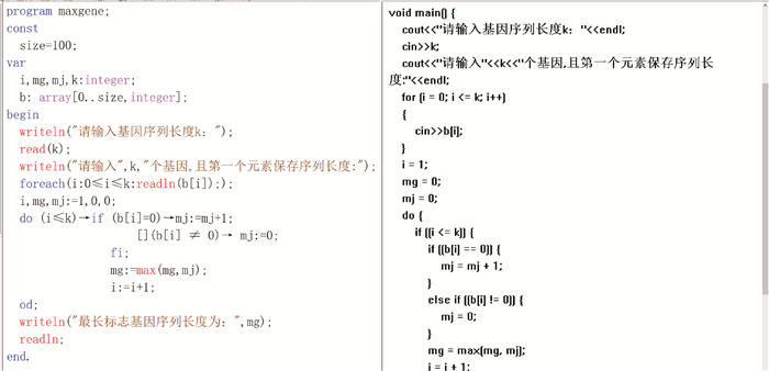 最终验证成功,结果如图 9所示。通过C++程序自动生成系统,可将IMP抽象程序自动生成对应的C++程序。自动生成最长标志基因问题的C++程序如图 10所示,左边为最长标志基因序列问题的IMP程序,右边为转换的C++程序。对生成的C++程序进行测试,输入任意一段基因序列,测试结果正确,如图 11所示。