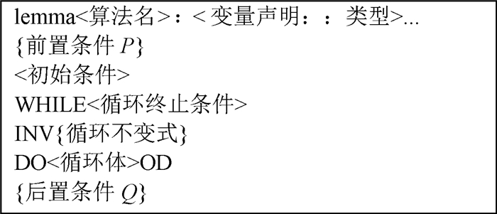 VCG可以自动生成验证程序正确性的条件,再由定理证明器进行证明,从而大大提高了算法程序验证的自动化程度。VCG实现了霍尔逻辑规则的自动化和形式化,在Isabelle定理证明器中利用VCG验证算法程序,需要提供该算法的初始条件、前后置断言、循环体和循环不变式[16],VCG代码结构如图 3所示。VCG基于pre和vc两个函数,pre函数类似于Dijkstra最弱前置谓词方法,vc函数的作用则是生成验证条件。