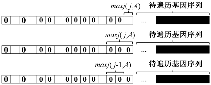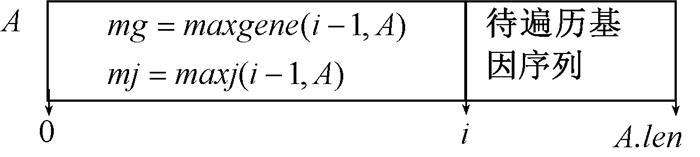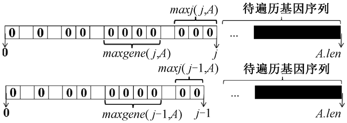maxj(j, A)只记录当前的标志基因长度,因此还需定义函数maxgene(j, A),其记录基因序列A[0:j]中标志基因的最长连续长度。maxj(j, A)的值与当前A[j]的值有关,不能保存前面标志基因段的长度。maxgene(j, A)函数的具体说明如图 6所示。