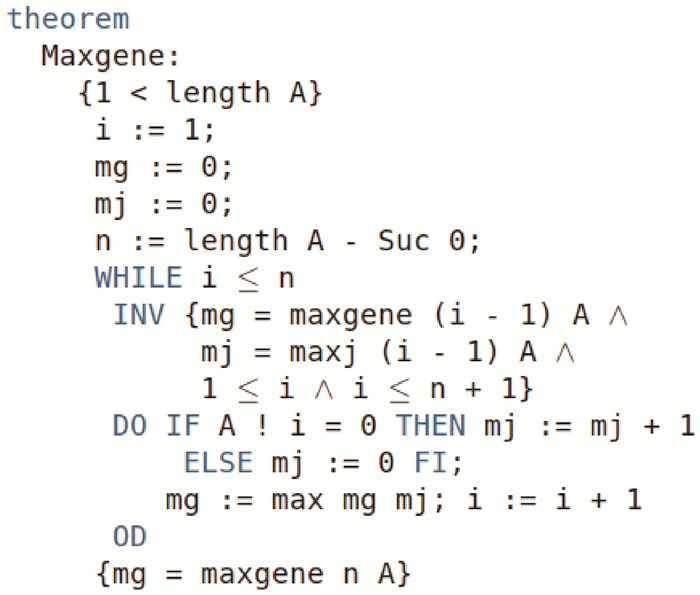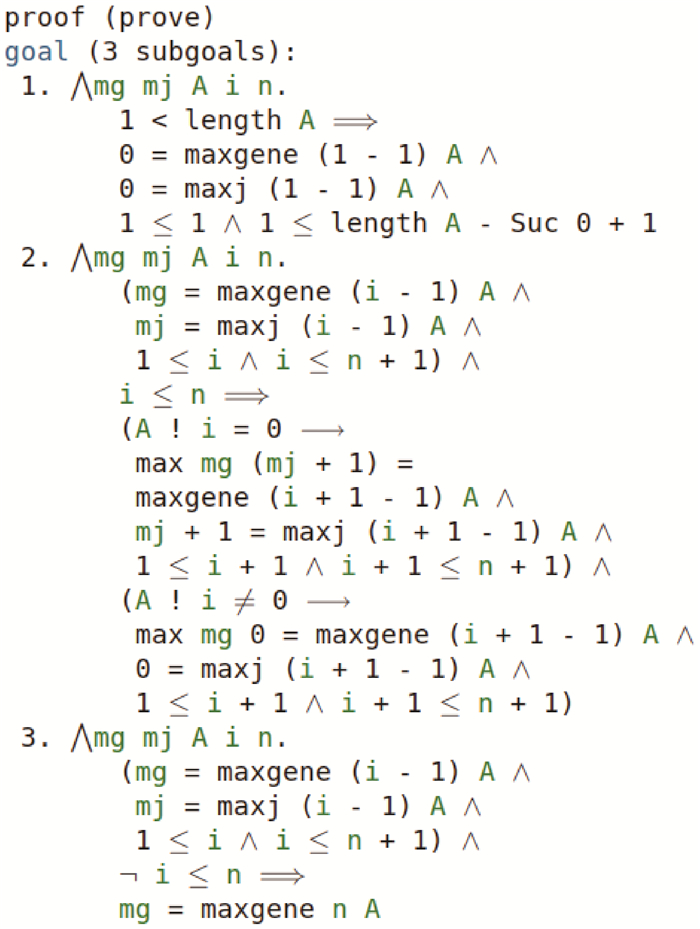 | $ \begin{aligned} &m g, m j:[{inv} \wedge i \neq A . { len, } m g={maxgene}(i, A) \wedge\\ &m j={maxj}(i, A) \wedge 1 \leqslant i+1 \leqslant A . { len }] \subseteq\\ &m g, m j:[i n v \wedge i \neq A {. len }, (m g=\\ & { maxgene }(i, A) \wedge {mj}={maxj }(i, A) \wedge\\ &1 \leqslant i+1 \leqslant { A. len })[m g \backslash max (m g, m j)]] {; } \end{aligned} $ |